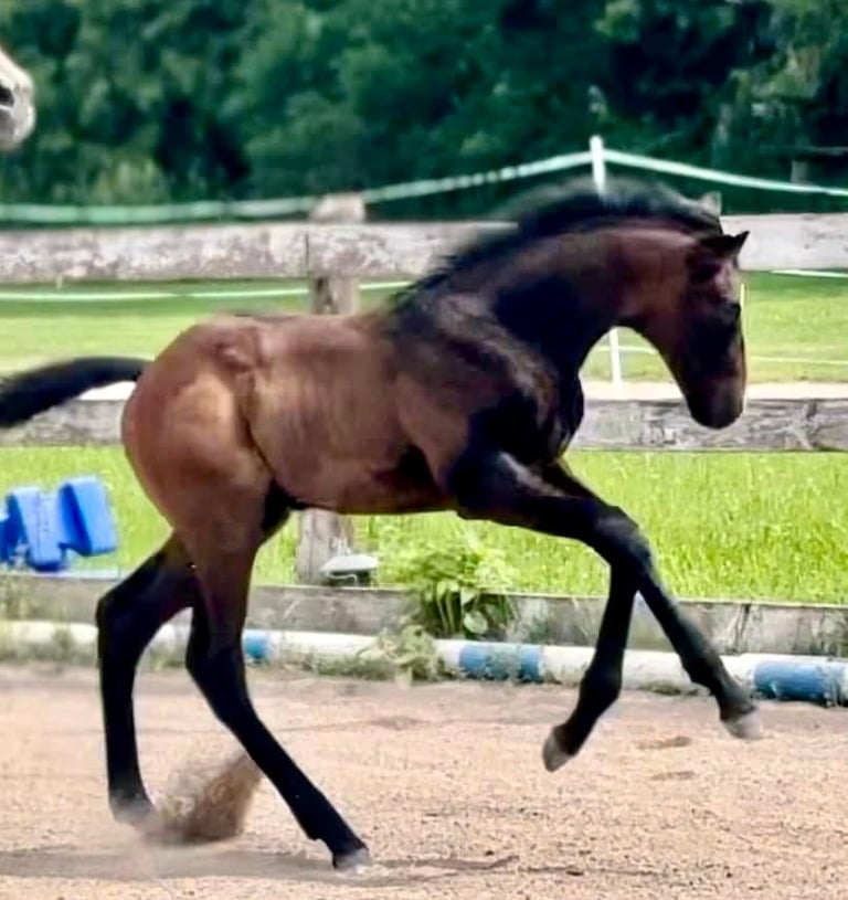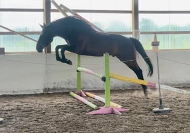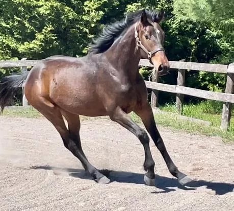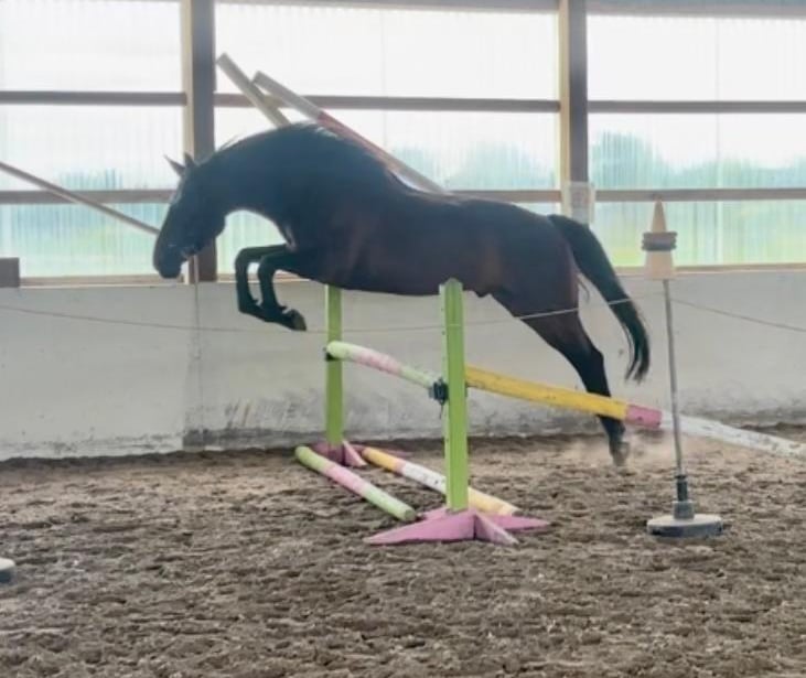 He had a professional start with a dressage rider to give him a great foundation to now build on. He is going walk, trot and canter under saddle. He has done some free jumping and shows great potential.